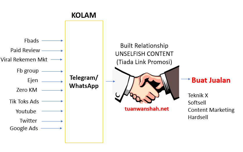 Untuk membawa mereka ke kolam kita, anda perlu bersedia beberapa plan untuk membawa masuk mereka dalam telegram atau whatsapp. Di dalam gambar rajah di bawah anda boleh lihat bagaimana saya susun strategi dari mula hingga dapat buat jualan. Ini adalah kisah benar dari pengalaman dan juga ilmu dari guru yang mengajar saya.